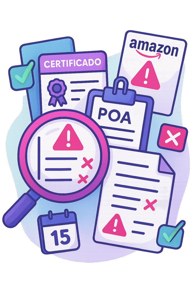 - Reunimos facturas, certificados, pruebas de autenticidad y verificamos que la documentación cumpla con todos los requisitos que Amazon solicita.